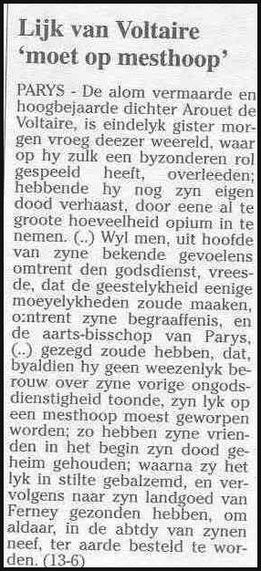 De weg naar volwassenheid in het denken van de mens begon eigenlijk pas tot de maatschappij door te dringen in de tijd van de verlichting. Er ontbrandden heel wat lampjes in die tijd en daarmee verdwenen een hoop bijgelovigheid en barbaarsheid. Voltaire was in de 18e eeuw de meest vooraanstaande denker, en hij zette een hoop religieuze praktijken en gedachten voor schut. De naam van Voltaire wekt in gelovige kringen nog steeds heftige reakties op. De reden hiervan is niet dat deze man een immoreel leven leidde – integendeel, hij zette zich in als geen ander om onschuldige mensen te redden – maar omdat hij de kerk en het geloof van barbaarsheid en achterlijkheid beschuldigde, sterker nog, als oorzaak van de onmenselijkheid van de mens zag. Daarom is Voltaire nog steeds actueel. Neem bijvoorbeeld een hoofdstuk als 2 Kronieken 16 onder de loep, een verhaal waar ik toevallig vanmorgen op stuitte en waarvan ik me kan voorstellen dat Voltaire er heftig op gereageerd zou hebben. Er wordt over een koning Asa gesproken. Deze koning van Juda wordt aangevallen door de koning van Israël. Asa herinnert zich dat zijn vader een verbond sloot met een buitenlandse koning van Aram. Hij vraagt om diens hulp en wordt uit zijn nood verlost zonder veel bloedvergieting. Hoe reageert God in de bijbel? Hij zendt een profeet met de boodschap dat Asa verkeerd gedaan heeft door op een buitenlandse bondgenoot te vertrouwen en niet alleen op God. Als hij alleen op God vertrouwd zou hebben, dan zou God ook de koning van Aram hem in zijn macht gegeven hebben. We zien dus dat het in het Oude Testament er helemaal niet om gaat oorlogen te vermijden, of de hoogste vorm van menselijkheid te vinden, maar enkel en alleen om God maar aan je zijde te hebben wanneer je strijdt, want dan zul je altijd overwinnen. Evenlater in hetzelfde hoofdstuk wordt Asa, toen hij uiteindelijk ziek werd, door de bijbelschrijver berispt op de volgende manier: ‘Zelfs in zijn ziekte zocht Asa geen hulp bij de Here, maar bij dokters’. Letwel, het ging hier om een godvruchtige koning die nota bene in zijn leven een eed had afgelegd Jahweh in geheel zijn leven te dienen en te eren! Al zijn handelen was dus in het geheel niet gericht tegen God. Hij deed niets anders dan wat wij elke dag doen: zijn gezond verstand gebruiken! Dit is dus juist datgene waar de vrome godsdienst altijd tegenin gaat.